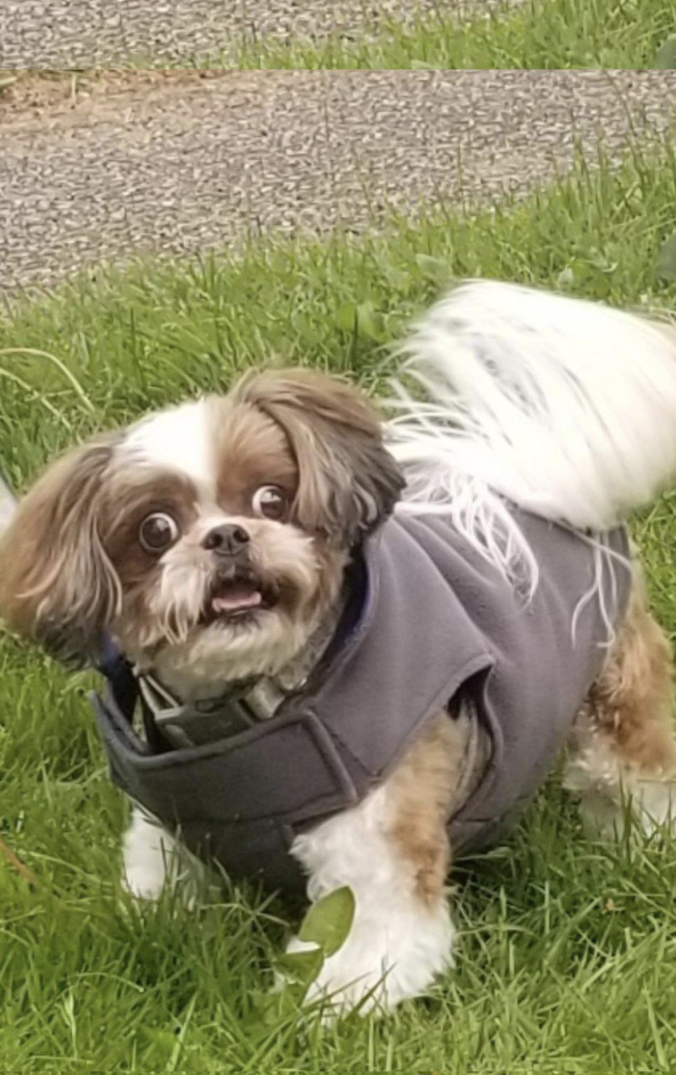 ▼照片中的西施犬穿著厚實的衣服,主人正牽著牠在草叢裡散步。牠轉頭看向左側時,發現美容師竟站在旁邊,嚇得瞪大眼睛、嘴巴張開,整隻狗愣在原地,那劇烈的反應超可愛。