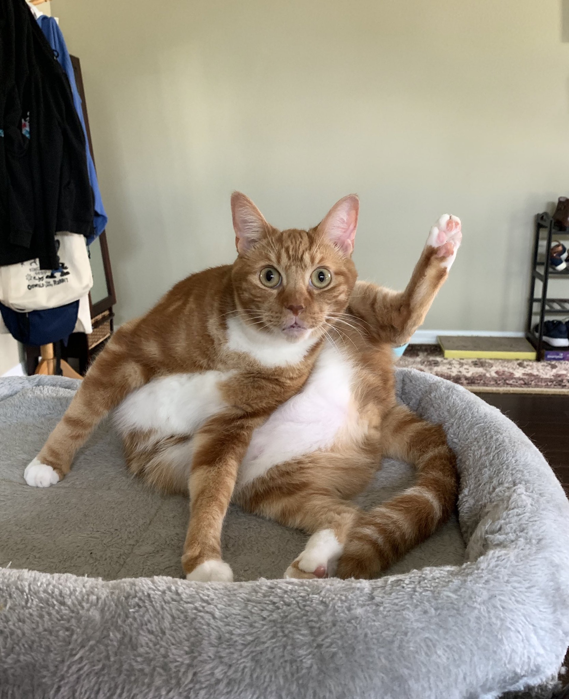 ▼貓咪瞪著大眼睛看向前方,抬起的後腳忘記收回,整體造型非常怪異。主人覺得這一幕很好笑,不僅拍攝下來,還親自動筆畫下來,並將照片po到推特上,說:「我家貓舉起手Say Hi!」
