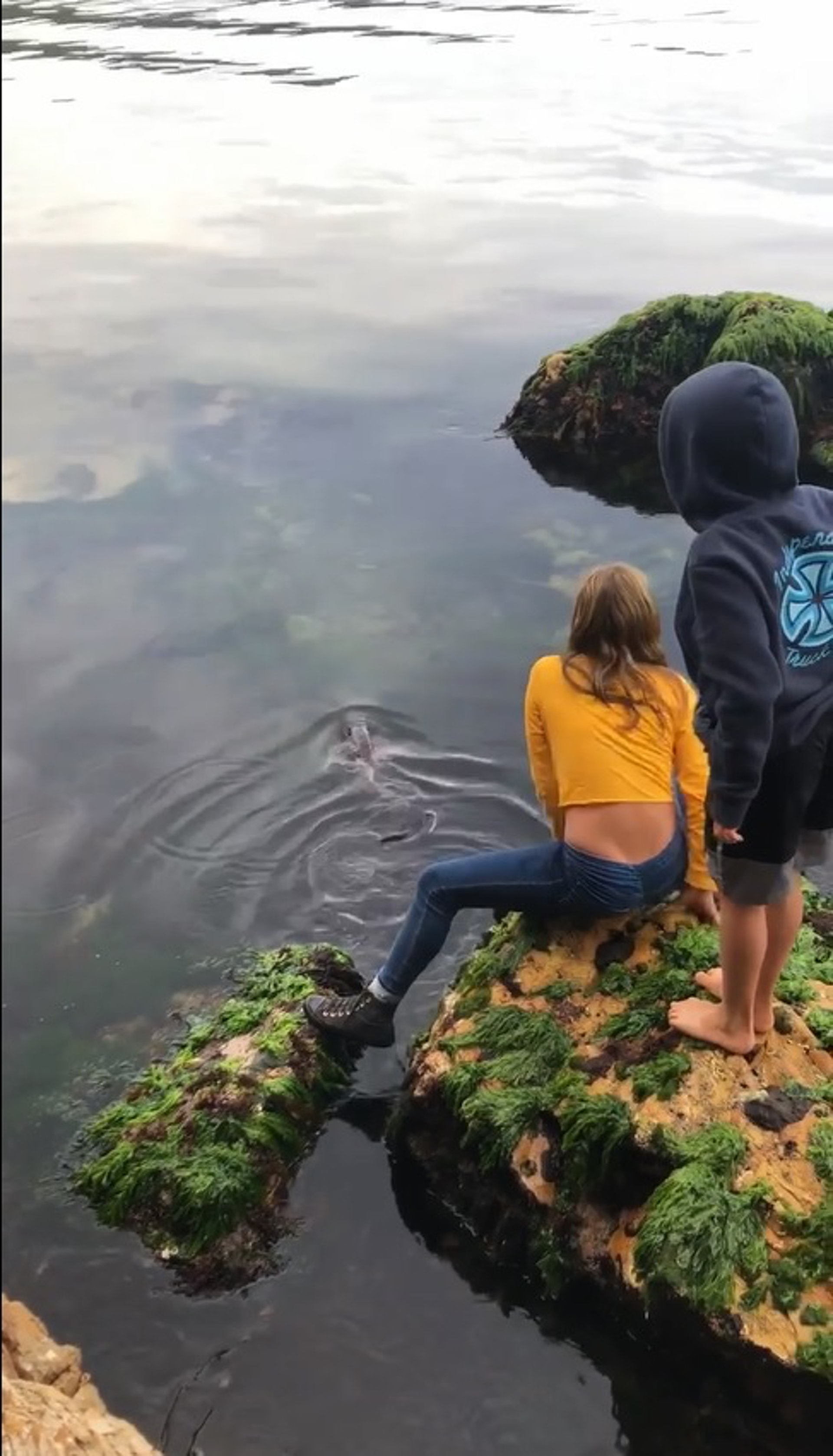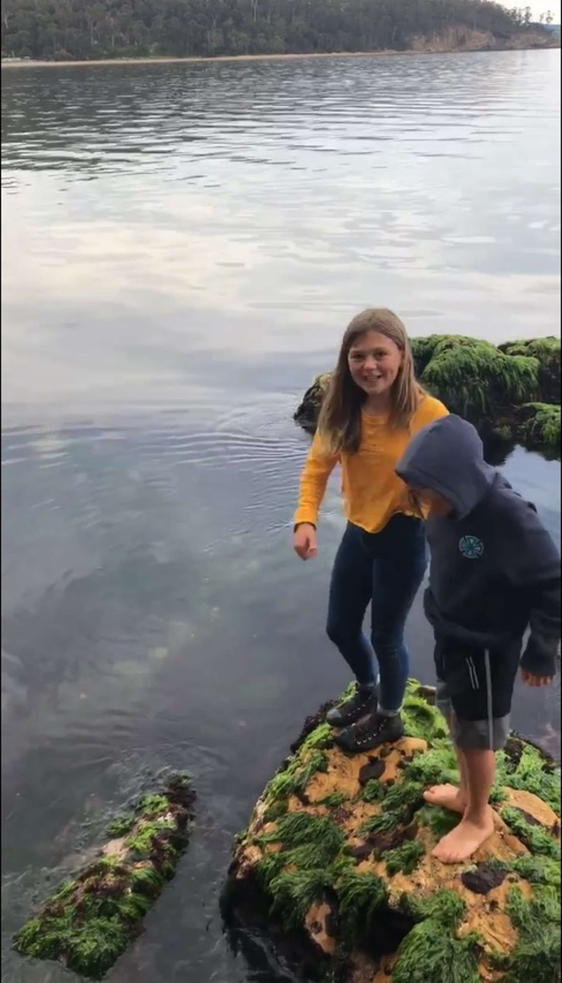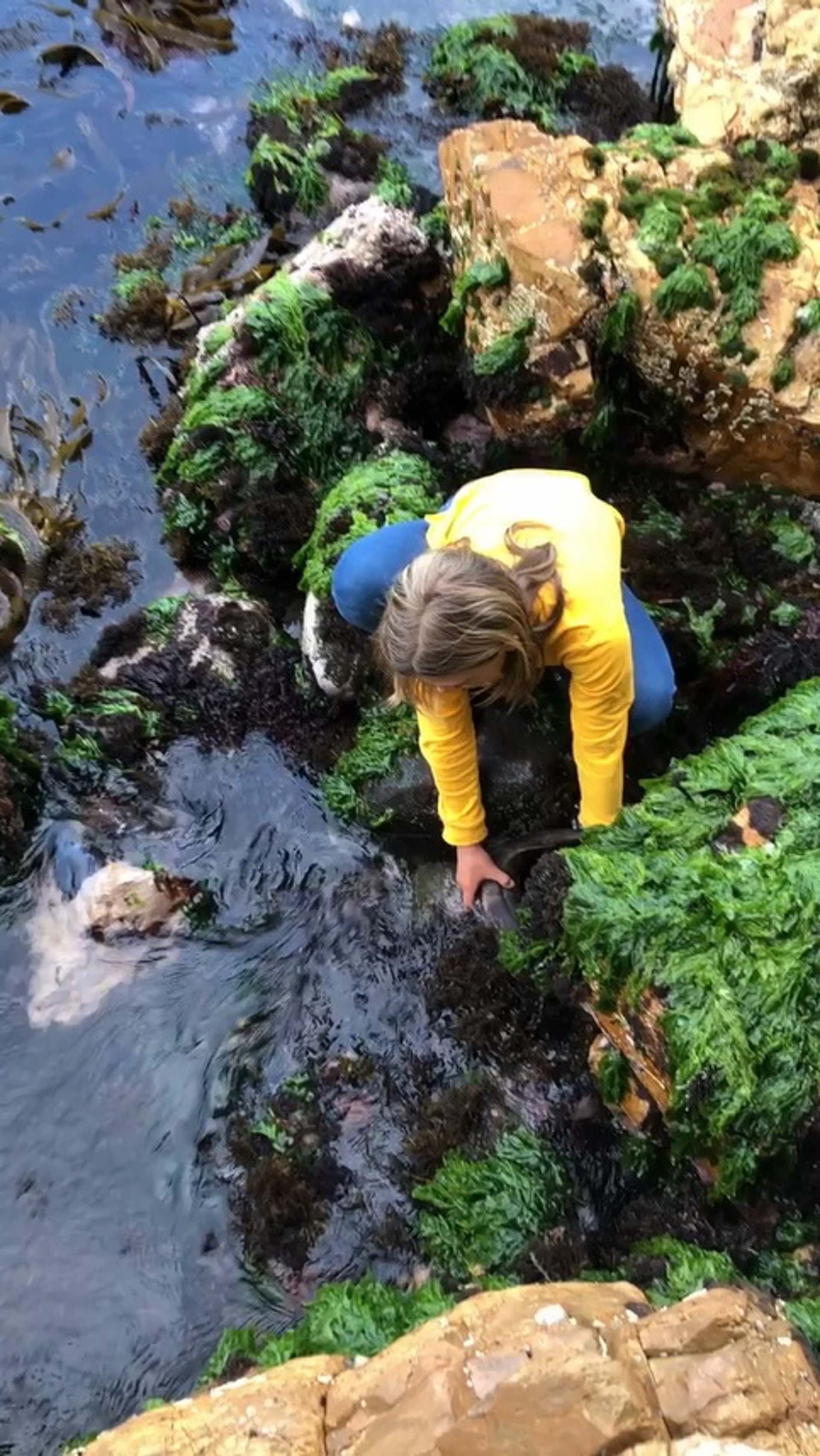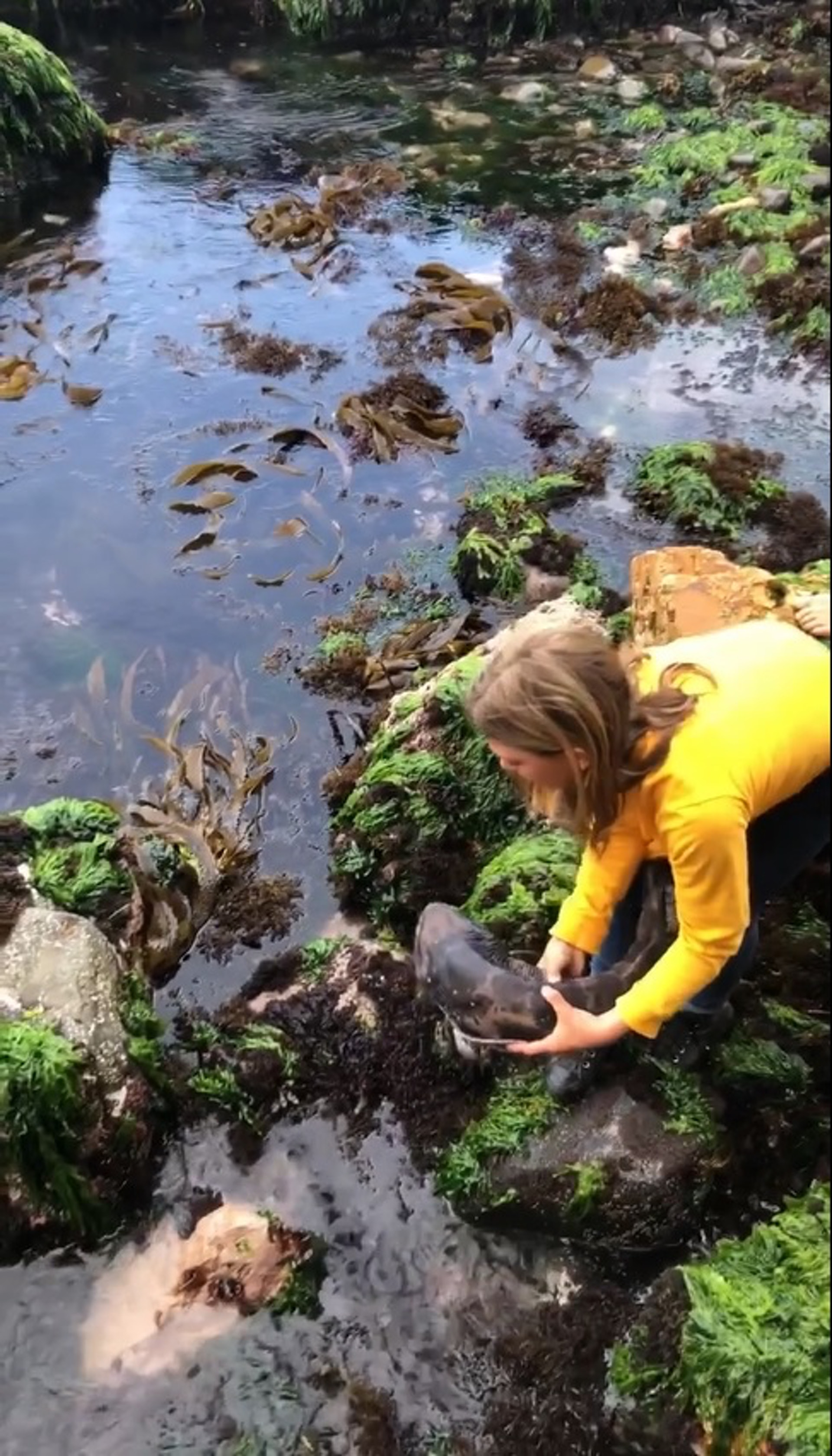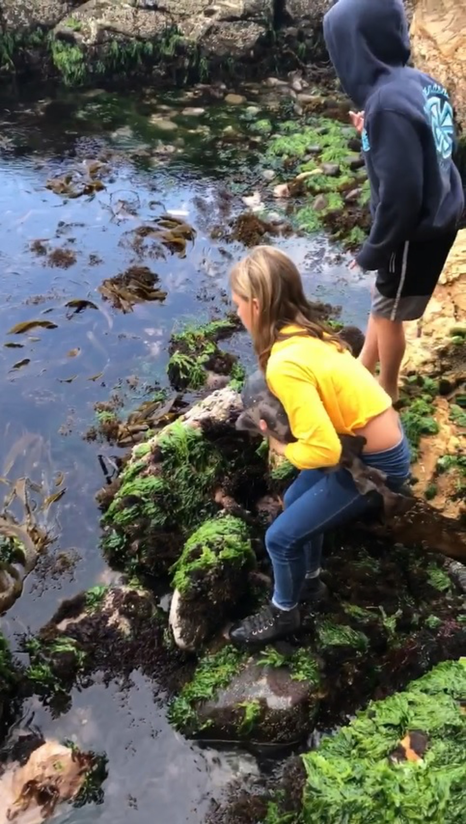 ▼沙灘的石頭上有很多青苔,非常溼滑,Billie看到擱淺的小鯊魚後對媽媽說:「我看到一隻鯊魚!」接著她就徒手將鯊魚抱起來,然後小心翼翼跨過佈滿青苔的岩石,成功將牠放歸大海。媽媽Abby Gilbert連忙叮囑她:「這些岩石又濕又滑,小心一點。」