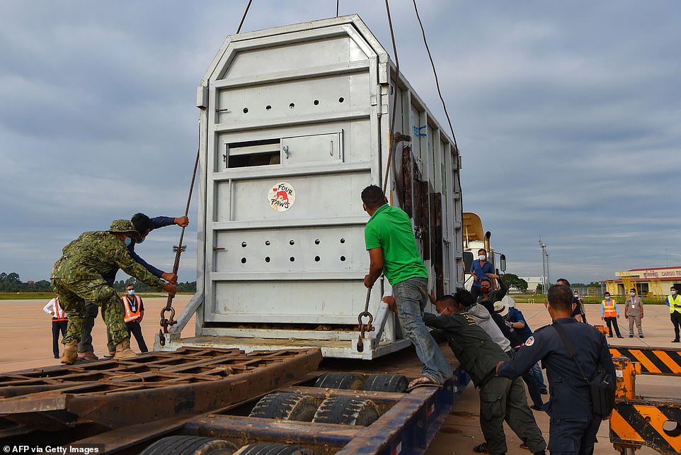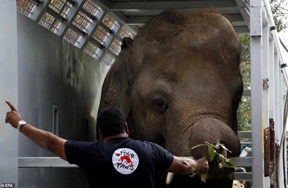 ▼專家和動物權利組織Four Paws的獸醫們準備了好幾個月,終於在11月29日開始移動作業。他們花費好幾個小時將Kaavan誘進一個10噸重的金屬製運輸箱中,然後將運輸箱送到機場。搭乘10個小時的飛機後,Kaavan抵達目的地。