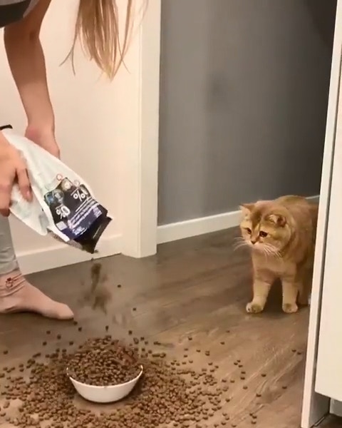 ▼但接下來主人卻沒有像平常一樣停手,反而越到越多,貓糧都溢出來了!
