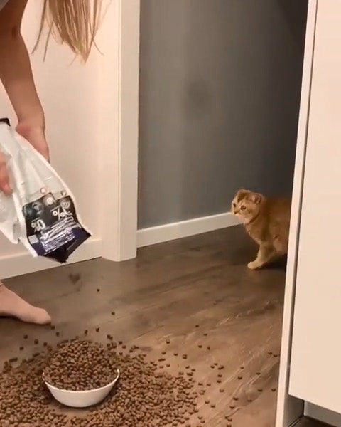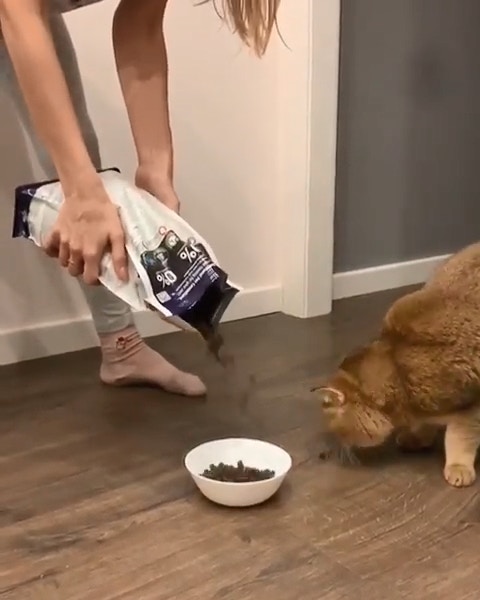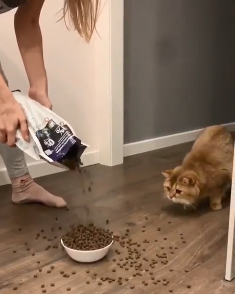 ▼當主人倒出貓糧時,牠還立刻吃起了掉到碗外的貓糧,「這可不能浪費了~」