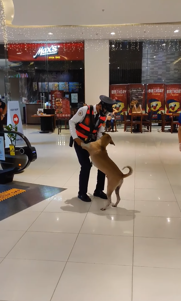▼保全陪狗狗玩了一會兒,輕輕抓起狗狗的前腳,慢慢帶著牠往門口的方向移動。他沒有將狗狗驅離,因為賣場的主管認為這隻狗狗很喜歡這裡,於是決定給牠提供一個職位,讓這隻狗狗成為賣場的活招牌。這隻狗狗有了一份工作,以後再也不用流浪了。