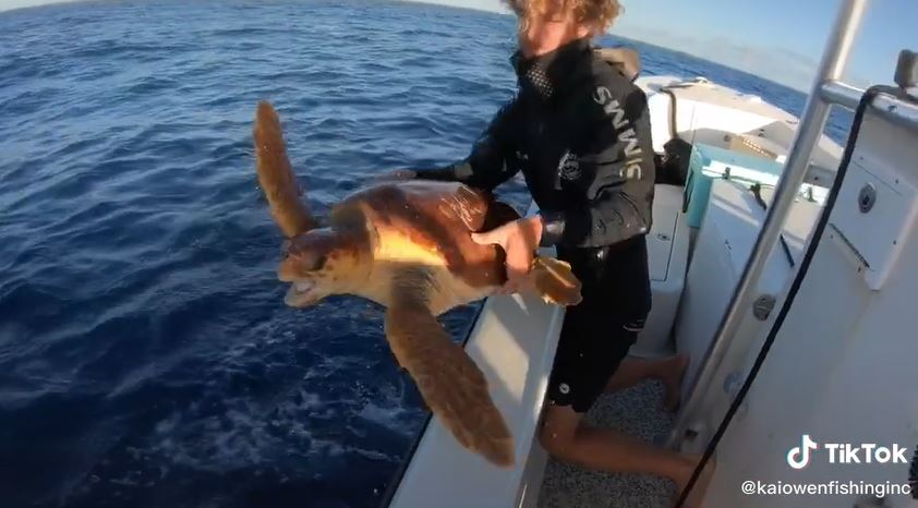2020年12月08日大海龜遇到了英雄!不久前兩名網友到巴哈馬(Bahamas)附近海域釣魚,偶然看到一隻鼬鯊正在捕食海龜,準備將海龜吞下肚。海龜全力逃到他們的船邊,甚至想要跳到船上來。他們實在無法眼睜睜看著這隻海龜被吃掉,決定伸出援手救下牠。