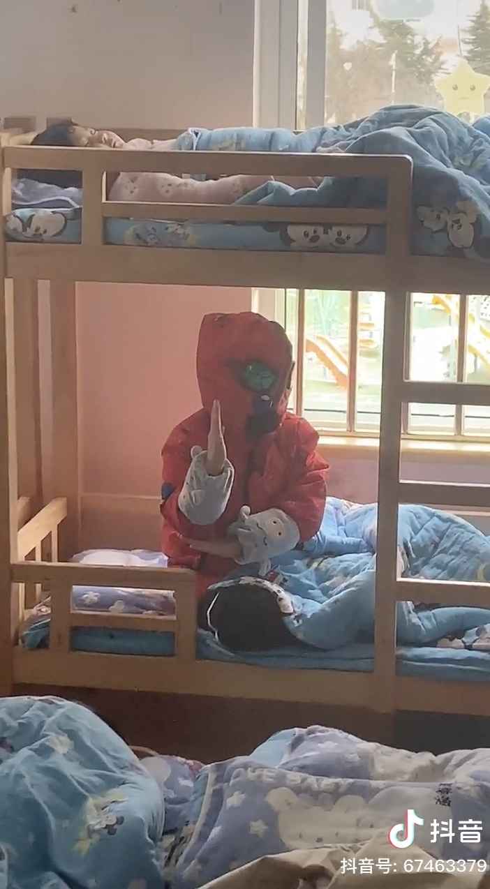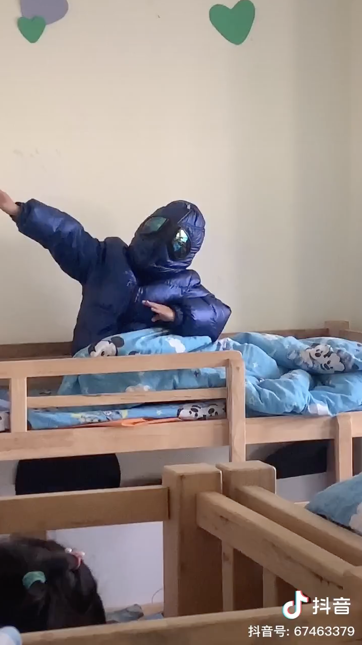▼老師無奈說:「大家都睡了,你們倆卻在『拯救地球』!」後來老師接受採訪時說,這兩個孩子戶外活動玩得太興奮,午休的時候還穿著外套在那裡玩。老師只能哄他們說:「小怪獸已經退場了,快脫下外套休息吧。」他們這才脫下衣服睡午覺。
