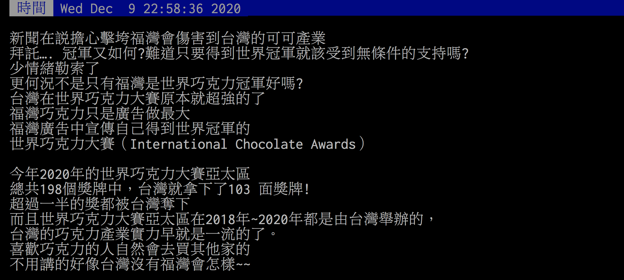 2020年12月10日自從福灣巧克力的醜聞冒出以後,許多民眾發起拒買福灣巧克力產品的運動,和福灣有合作關係的廠商也將他們的巧克力口味產品下架。大家開始擔心這次的事件是否會影響到台灣的可可產業,畢竟福灣也是代表台灣到巧克力大賽奪冠。不過有專業的網友在PPT上回應這樣的擔心「純屬虛構」!