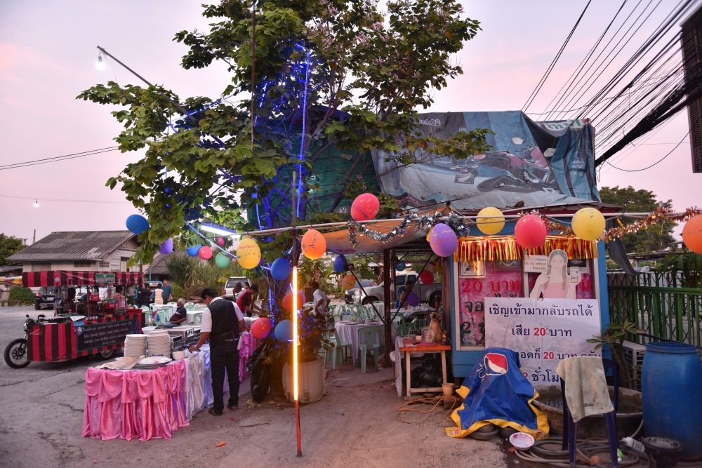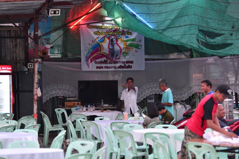 ▼他在停車場搭棚子,專門請來外燴業者辦流水席,不管是親友還是陌生人,只要想來分享快樂,就可以入座用餐。這一消息在網路上流傳開後,很多人帶著自家的狗狗前來參加流水席,恭喜Boonsong找回愛犬。
