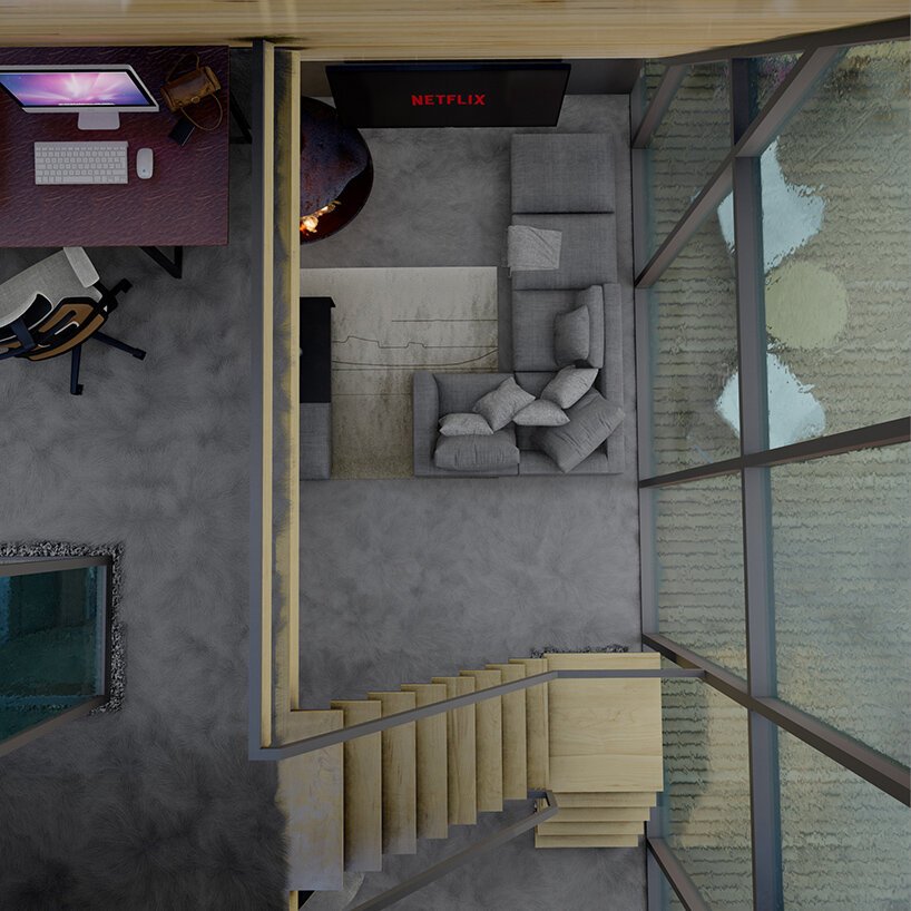 ▼小屋內的裝潢也沒有讓人失望,大面積的淺色木質材料,搭配深灰色的牆壁,形成強烈的對比。中間的玻璃流水牆更加夢幻,似乎跟室外的森林融合起來。室內的色調整體偏暗,但能帶來一種心靈上的安寧。