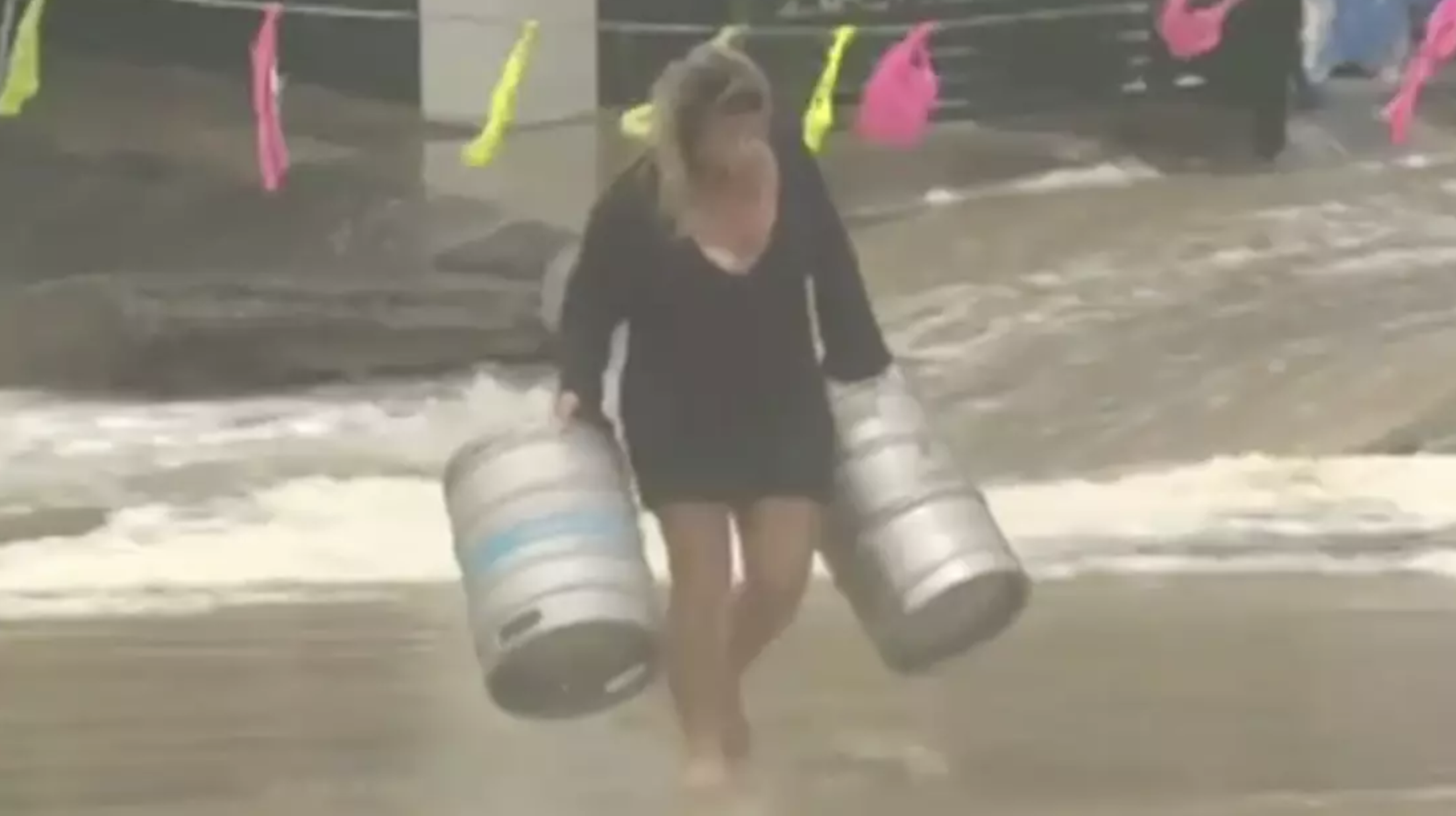 ▼7News拍攝到的畫面顯示,一名女子跳入洪水中,撈起2個從當地的衝浪俱樂部沖走的啤酒桶(從2:09開始)。