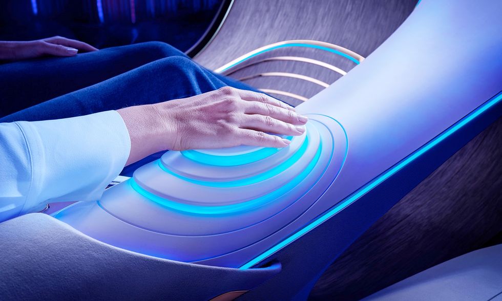 ▼AI手掌控制器取代方向盤:VISION AVTR以「手掌控制器」取代一般常見的方向盤,只要將手放在座位右側的感應器上,控制器就能偵測到駕駛的心跳和呼吸,並且透過AI智能,判斷這是否為車主本人。確認是車主後,控制器會升起,前後左右稍稍移動手腕就能控制車輛,跟玩電玩很相似。