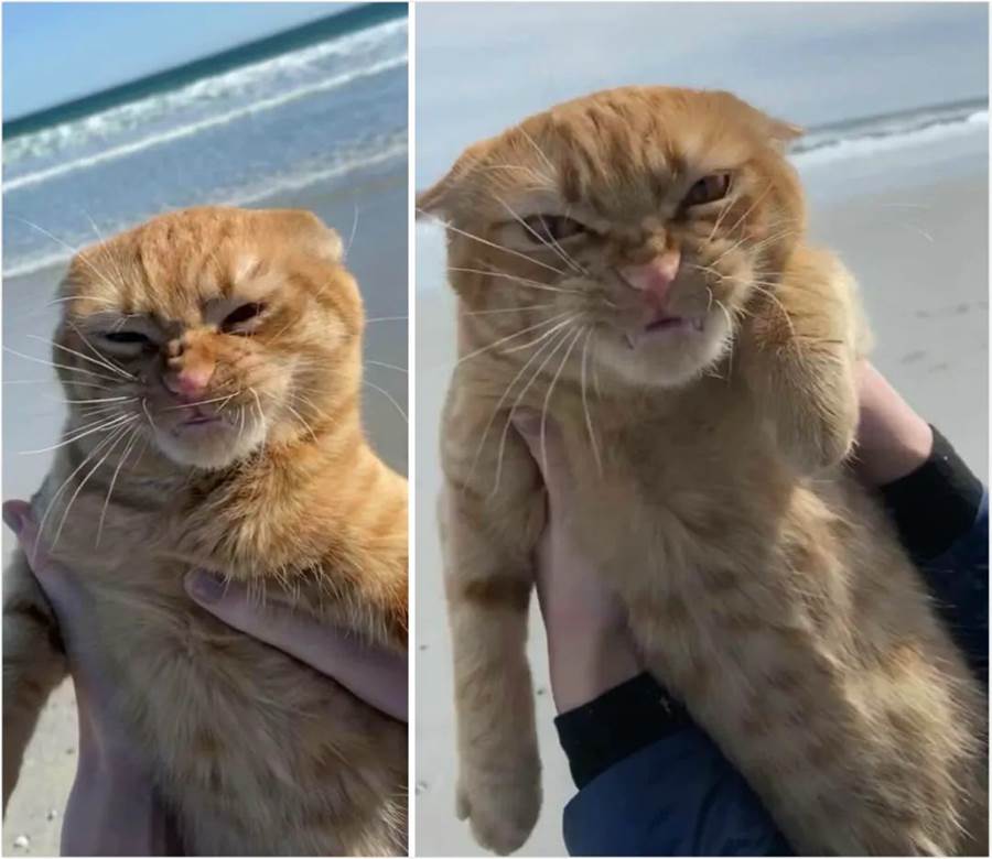 看表情就知氣噗噗! 主人帶萌貓去沙灘玩「海風太大」 牠被吹到皺眉大罵:這什麼地方?!