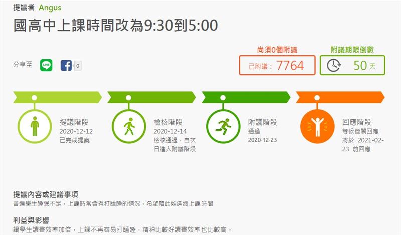 ▼提案者認為,現在上課時間太長,普遍學生睡眠不足,上課時經常有瞌睡的情況。希望能夠延緩上課時間,讓學生讀書效率加倍,上課不再容易打瞌睡,精神比較好讀書效率也比較高。