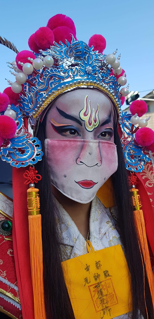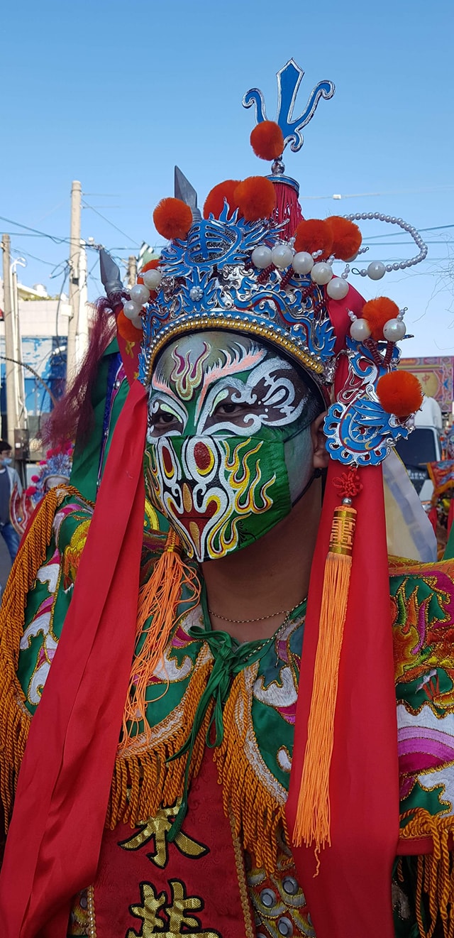 ▼廟方人員將臉譜直接畫在口罩上,跟演員臉上的圖案完美搭配,並表示:「現在因應防疫期間,所以我們星期六出門南下進香,配合政策全程配戴口罩。」廟宇人員不僅精心準備口罩,進香活動全程都有認真配戴。