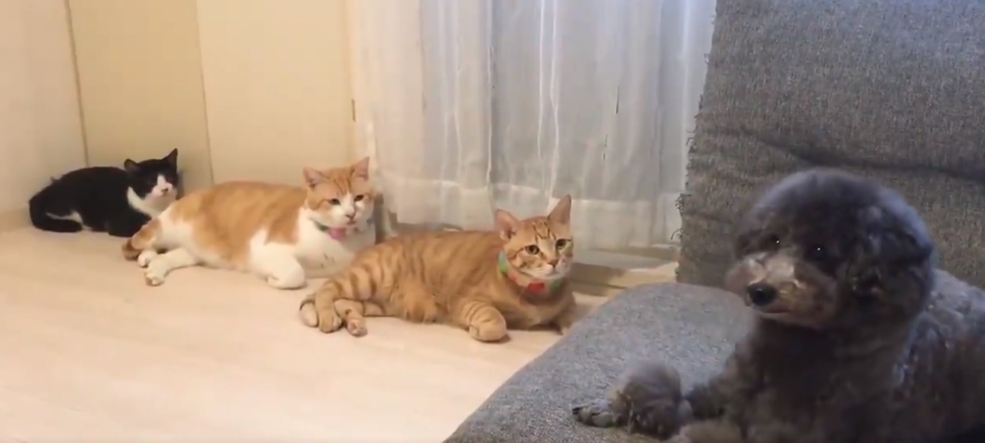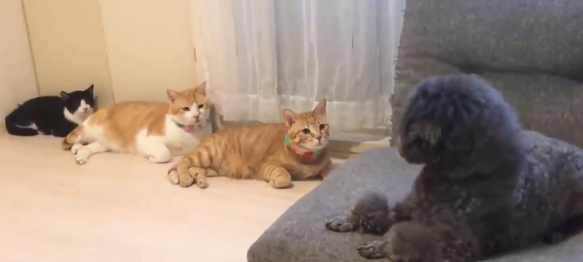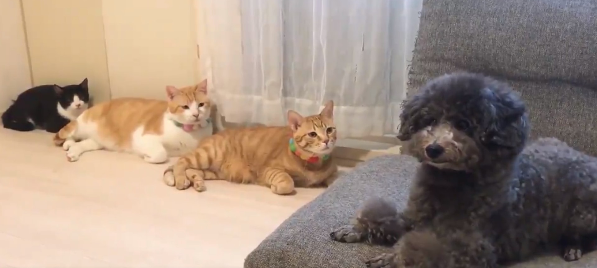 3隻貓後方「排排坐盯梢」 狗狗轉頭嚇一跳狂冒冷汗:皇上饒命!