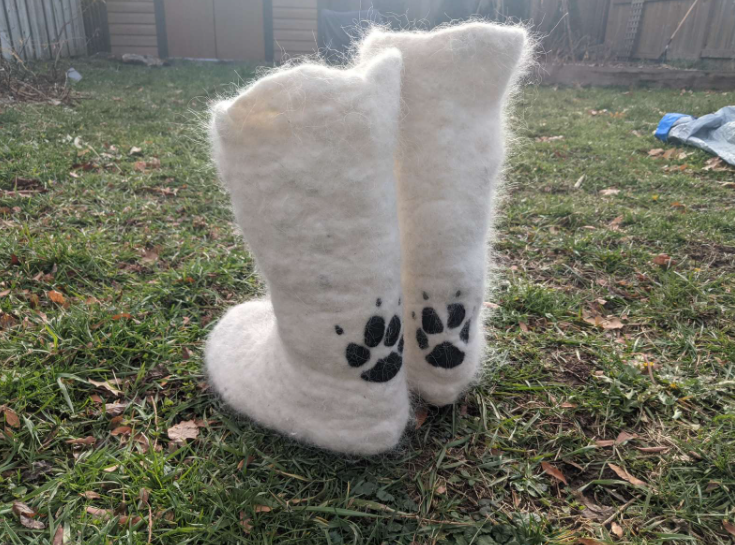 ▼Charlotte收到狗毛後立刻行動起來,她花了48個小時做出一雙毛靴,然後拍照給Soleil看。Soleil看到後讚嘆不已:「我看到用狗毛做出的靴子超激動,Charlotte還加上了狗狗的爪印做裝飾。沒想到用狗毛做的靴子這麼精緻,而且穿起來走路有種跟隨狗狗腳步的感覺,真的超甜蜜!」