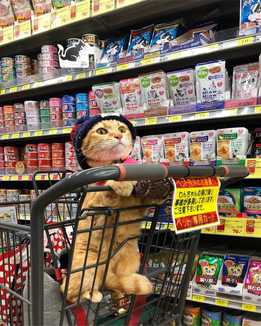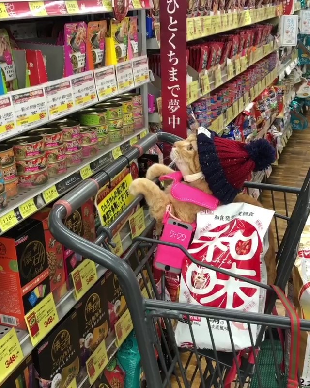 貓咪乖巧地坐在購物車上認真挑罐罐的模樣可愛到超過了!面對這麼可愛的喵咪,不管牠看上了哪些罐罐,主人都會甘心情願地帶回家吧!