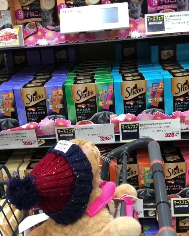 ▼來到寵物用品店的蘭子也馬上進入狀態,像個乖巧的小朋友一樣坐在購物推車內,小手手還緊握扶桿,眼睛已經開始研究哪種罐罐好吃了!