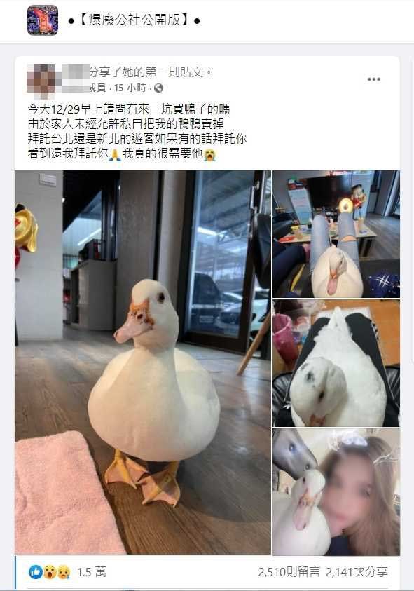 2020年12月31日怎麼能把別人的寵物偷偷賣掉?!桃園市一名正妹養了一隻可愛的寵物鴨,並取名為「胖檬」。不久前家人沒有告知她,就偷偷將胖檬賣掉了。正妹發現後非常著急,在臉書社團「爆廢公社公開版」po文求助:「看到還我拜託你!我真的很需要牠!」