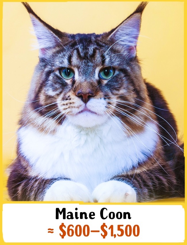 ▼6. 緬因貓。牠是最大的貓品種之一。其體重可達5至15公斤,成熟的貓體長可達1.23米。這個巨大的小貓的價格在18000到45000新台幣之間。