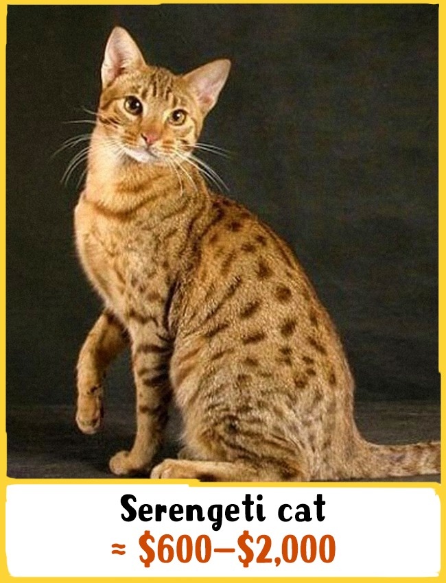 ▼9. 塞倫蓋蒂貓。這種品種於1994年在加利福尼亞被發現。成熟的塞倫蓋蒂的體重約為8-12公斤。牠們擁有發達的身體,大耳朵,斑紋毛色和很長的腿。牠的價格是18000到60000新台幣。