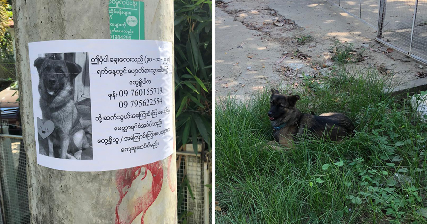 2021年01月02日走失的狗狗知道主人在找牠!不久前緬甸一位網友Myat Mon Mon Maung經過一根電線桿時,發現上面貼著一張「尋狗啟事」。剛開始他沒在意,但一低頭發現電線桿下坐著一隻狗狗,長得跟海報上的照片很相似!Myat連忙撥通海報上的電話,讓飼主來辨認一下。