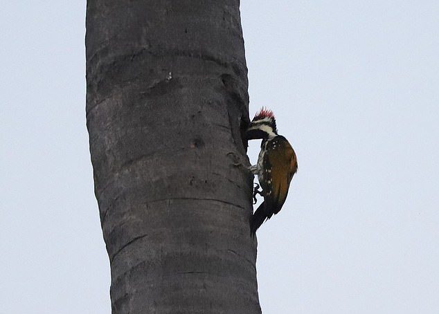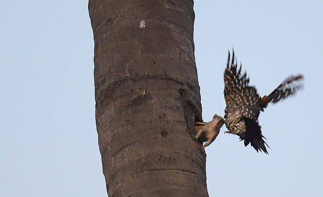 ▼啄木鳥被嚇到,連忙飛走去尋找其他目標。牠明明看到樹洞裡有松鼠在休息,還執著地啄樹幹,難怪松鼠會生氣。