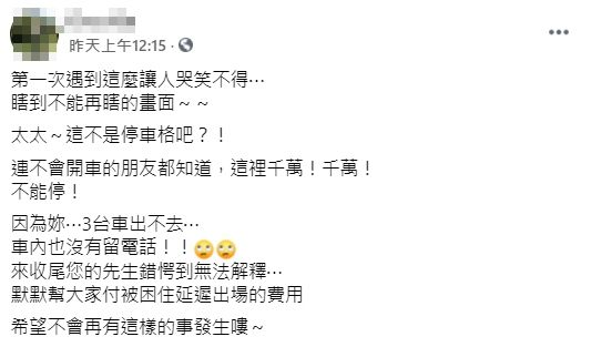 ▼原po無奈說:「太太~這不是停車格吧?!連不會開車的朋友都知道,這裡千萬不能停!」車主的丈夫來收尾時,錯愕到無法解釋。他只能默默幫大家付被擋住延遲出場的費用。原po嘆道:「希望不會再有這樣的事發生嘍。」