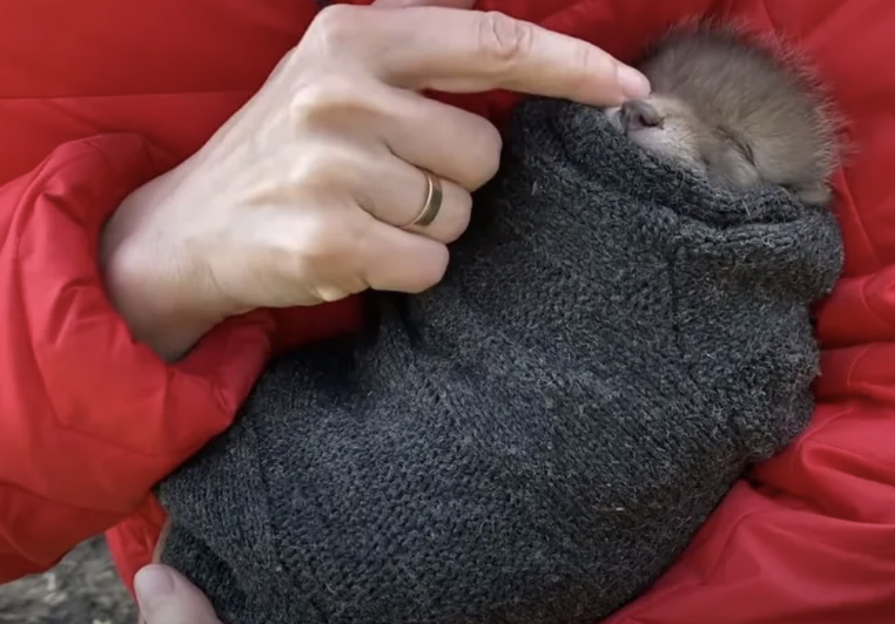 ▼小狐狸不怕人,牠大概也知道這兩個人會救自己,於是親暱地跑過去撒嬌。夫妻兩人用毛衣當毯子,將牠裹起來保暖。牠就像回到了媽媽的懷抱一樣,放鬆地瞇起眼睛。