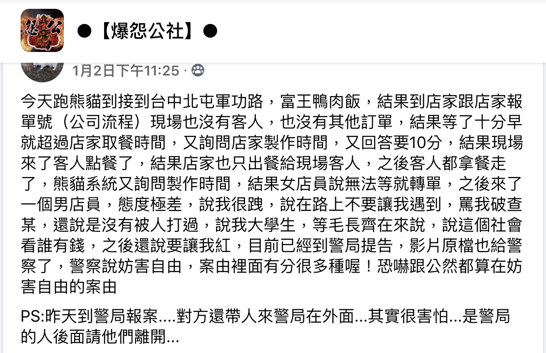 2021年01月04日這樣的態度怎麼做生意?日前一名外送員接到台中鴨肉店的單子,她在店外等了10分鐘,有3位客人拿餐走人,她還是兩手空空。她去詢問店員,對方卻態度很差,回「不等就轉單」;還有男店員大罵她「破查某」。她最後決定報案,店員竟帶人堵在警局外,嚇得她不敢踏出警局。
