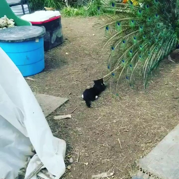 ▼農場主人Vincent Browning和妻子Shelly Lumpkin收編了許多動物,包括網紅長角牛,還有雞、豬、狗狗、貓咪和孔雀,以及一隻新來的小貓咪。這天小貓咪在農場內閒逛的時候,突然看到了孔雀「BlueBoi」開屏的絕美畫面。