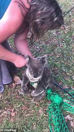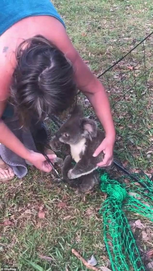 ▼那位救無尾熊的居民表示:「我們早上醒來時,發現牠被我們雞舍圍欄上的尼龍網纏住了。」無尾熊坐在原地,一名身穿藍色裙子的女子拿著剪刀幫牠解除纏在身上的尼龍網。她溫柔安撫無尾熊說:「沒問題的,我們會幫你的,乖一點不要掙扎喔。」