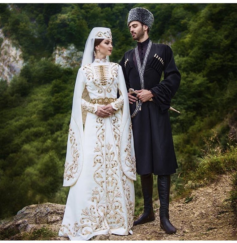 ▼奧塞提亞:新娘穿著長袖洋裝,洋裝上有金色的圖案,腰部還有金色腰帶,這是她們的護身符。