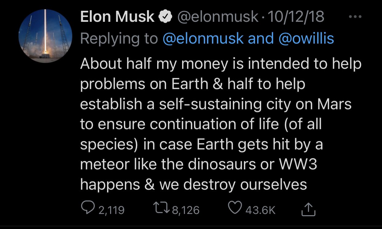 ▼網友們紛紛獻言獻策,其中按讚數最高的一則評論,來自一名網友截圖的馬斯克2018年時發布的計畫:「我會把一半的錢拿來解決地球上的問題;另一半則去火星上建造一個自主循環的城市,各種生物都能在那裡生存,以防止萬一小行星撞擊地球,人類面臨恐龍滅絕那樣的滅頂之災,或第三次世界大戰開打,人類自我毀滅。」