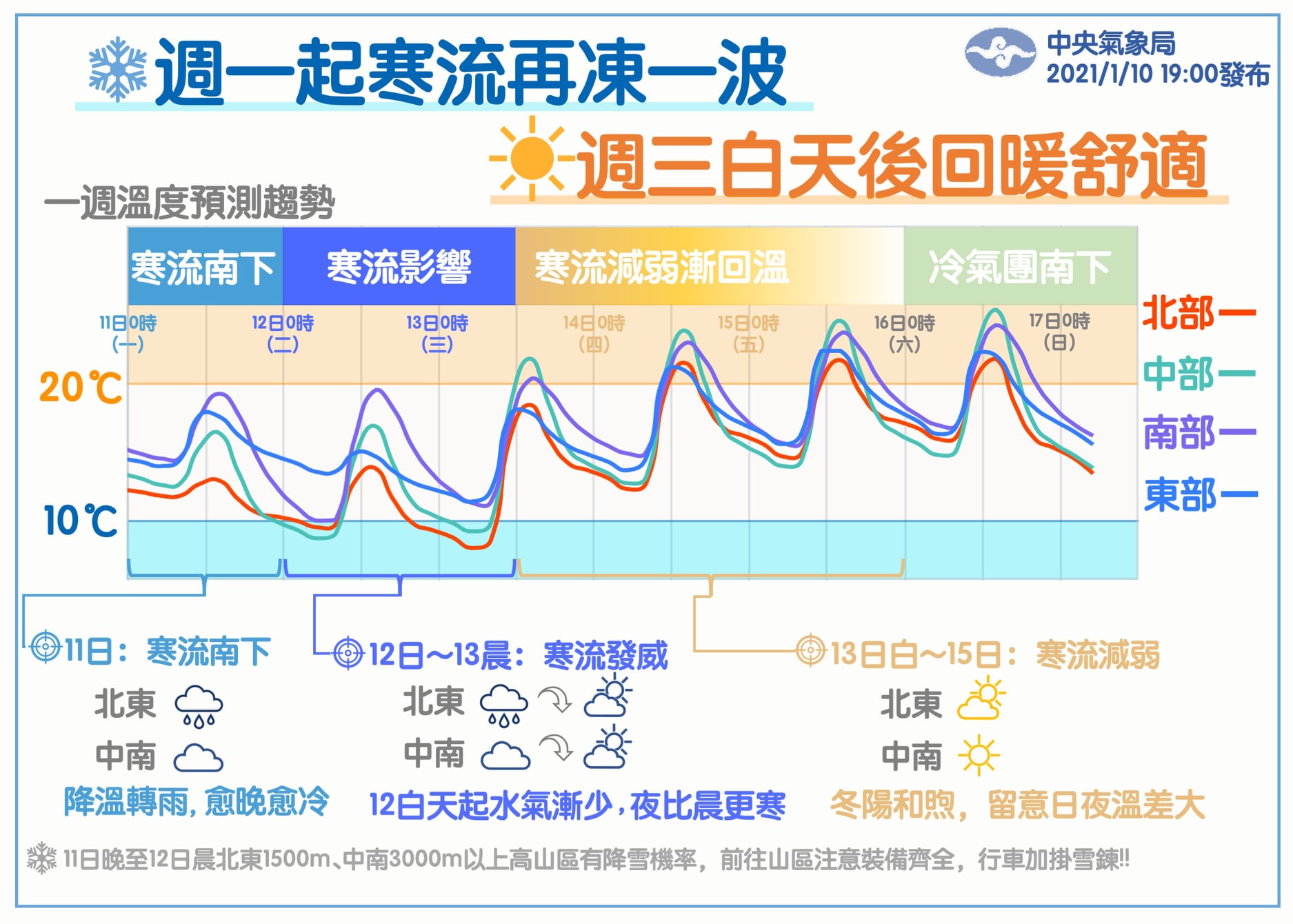 周三白天起寒流減弱,周三到周五(15日)各地大多屬多雲到晴的天氣,白天會有陽光,感覺溫暖舒適,但早晚仍有涼意,日夜溫差比較大。這幾天大家一定要留意氣象局發布的低溫特報燈號資訊,注意禦寒保暖~