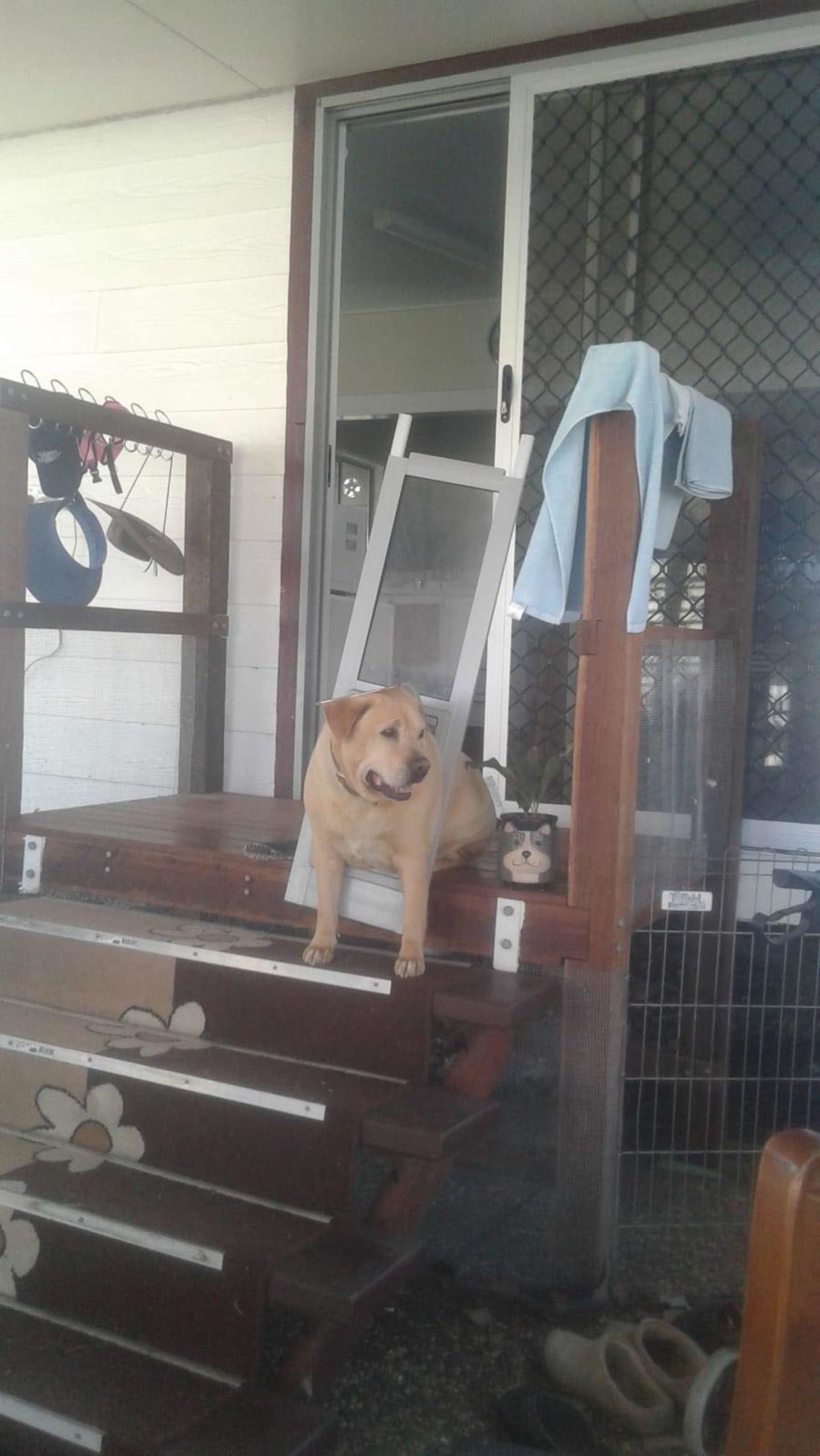 ▼Hulley的爸爸回家時,看到Drax腰上卡著特別的「腰帶」,坐在走廊上憨憨傻笑。牠似乎不明白,為什麼門會跟著自己到處跑。爸爸當場傻眼,忍不住哈哈大笑,先將這一幕拍下來,再將牠解救出來。