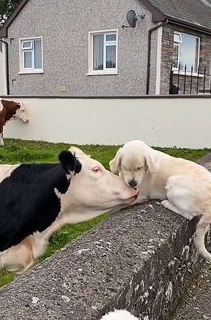 2021年01月12日狗狗很擅長交朋友,牠們不僅能跟人類相處得很好,還能跟其他動物相處融洽~北愛爾蘭弗馬納郡(County Fermanagh)有一隻叫Pablo的2歲金金,牠跟村里的一隻小牛感情很好。雖然這對好友物種不同、體型差別很大,但每次見面都非常親暱,Pablo溫柔舔小牛的臉時,那有愛的畫面讓人心都要融化了。