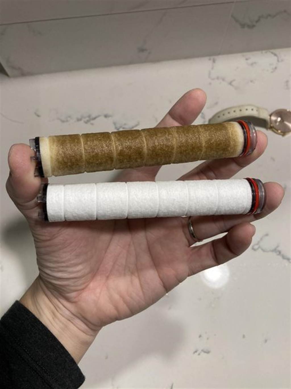 ▼原po本以為水塔出了問題,但去頂樓察看發現沒有異樣,水塔的蓋子也蓋得好好的。他打電話詢問自來水公司,因為當時已是深夜,只讓他語音留言。隔天早上他用2個同款白瓷碗裝水,發現經過濾水器的過濾水跟自來水顏色差很大。自來水明顯泛黃,而且有一些雜質。