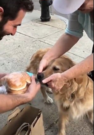 ▼當時Murphy正跟著老婆婆在散步。牠大概聞到了麵包的香味,直接把男子手中的麵包據為己有。主人和男子都讓牠鬆口,牠卻非常堅持。