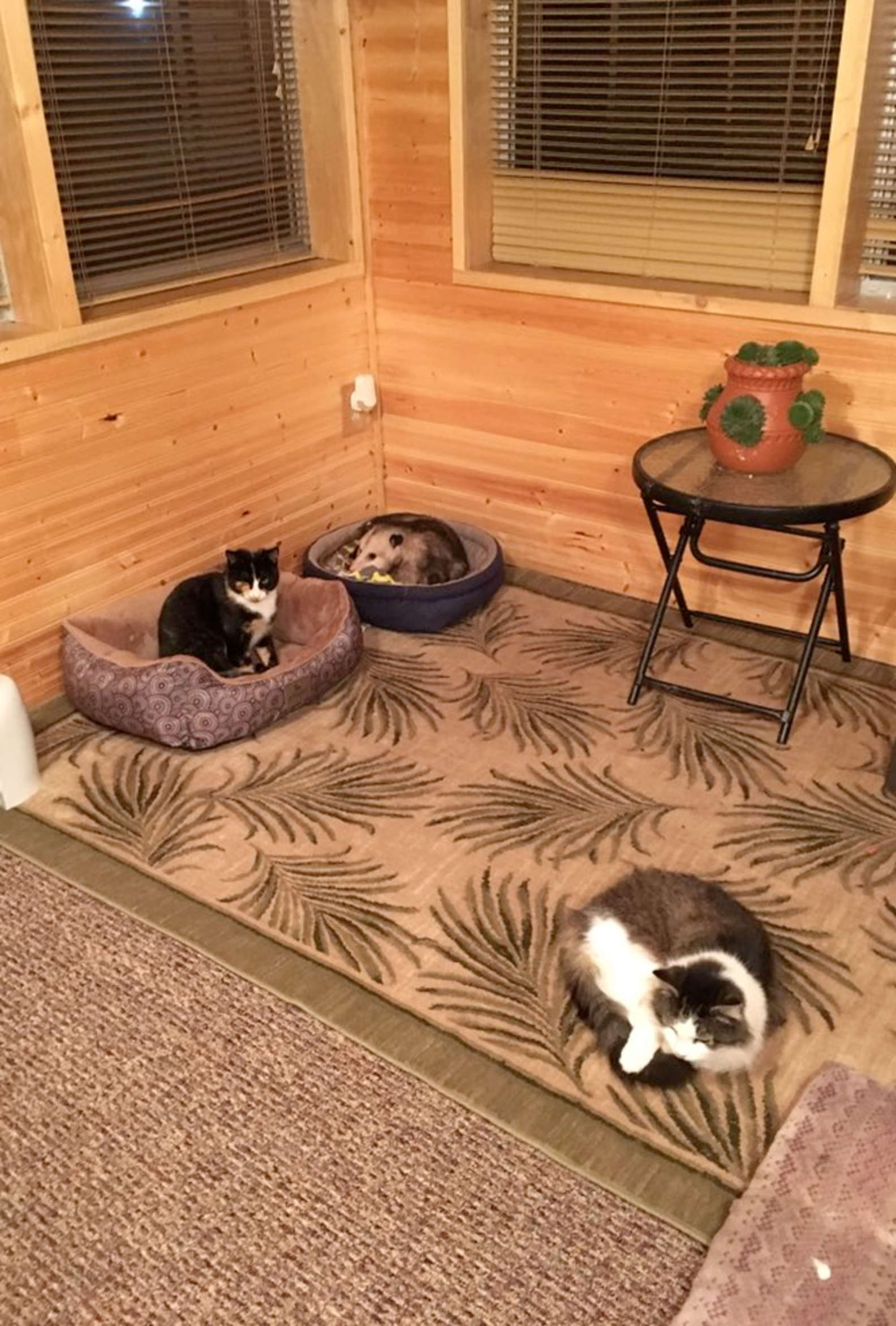 不知道這隻小負鼠是從哪裡來的,牠可能失去了家人,受不了野外的寒冷,又找不到食物,才跑來這裡取暖。小屋裡的貓咪們跟牠相處得不錯,對牠沒有敵意。阿嬤發現真相後不準備驅趕牠,因為阿嬤很愛動物,願意盡一切可能照顧牠們。Eric希望阿嬤的善良能夠激勵更多人~