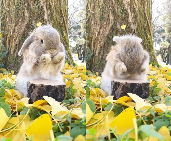 ▼這隻兔兔名叫PicoPico,影片中牠踩在鋪滿金黃銀杏葉的草地上,把身前的小樹樁當做水盆,毛茸茸的小手手在上面磨擦了兩下後,就開始在Q彈圓潤的臉頰上來回狂搓,就像是在做面部按摩一樣,畫圈的手法顯得超專業,可愛的畫面萌翻了一眾網友。