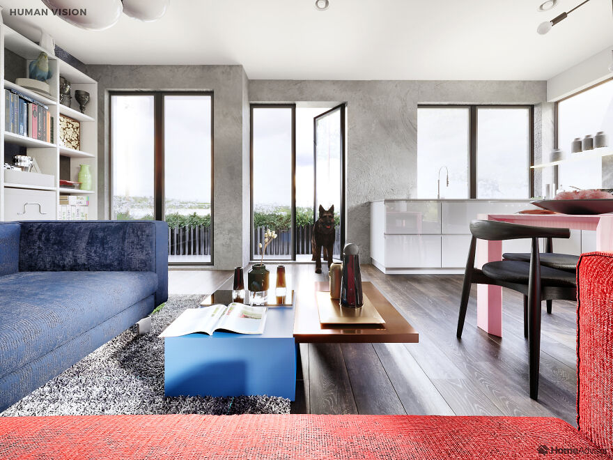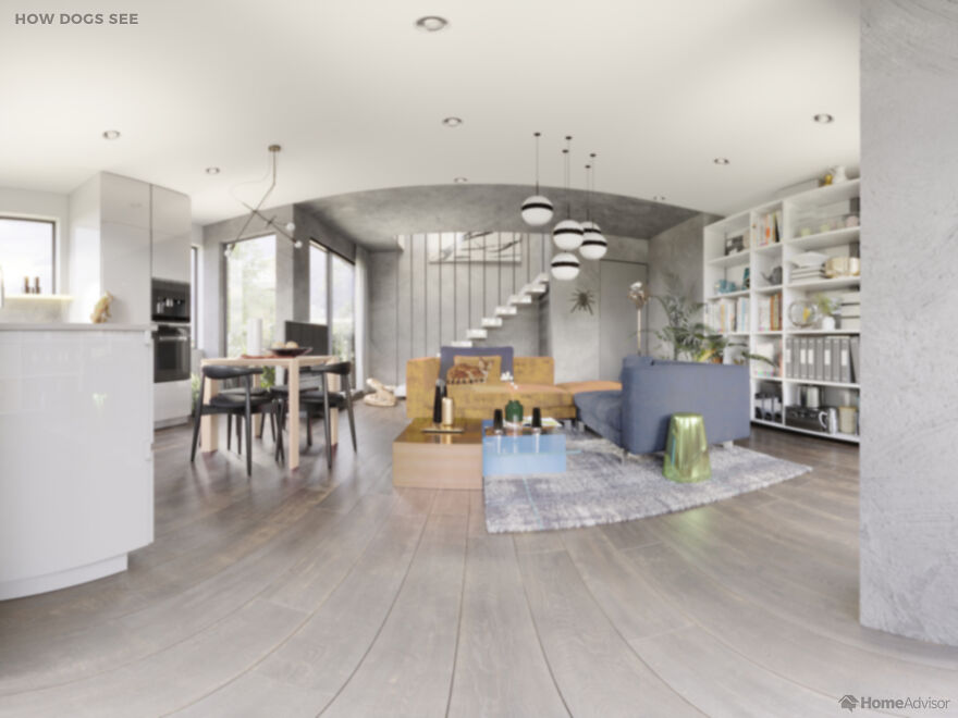 ▼這是狗狗看到的樣子:不管你家裡是什麼裝潢風格,在狗狗的眼中都會呈現柔和的海洋風格,這是因為狗狗的視錐細胞,會過濾掉一些色彩,牠們的眼中主要能感受到的是藍色和黃色。