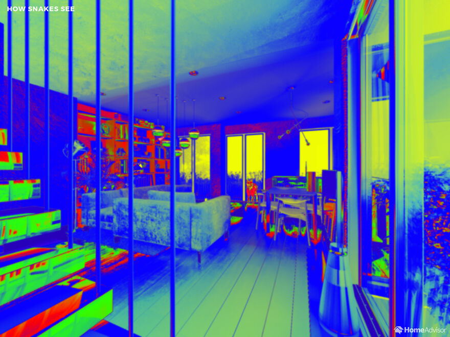 ▼蛇的視角:如果你家有養寵物蛇,那麼你可以不用考慮裝潢風格對牠的影響了,因為蛇的視力在白天非常差,根本看不出你的配色品味等,不過在夜晚會好很多。蛇的熱紅外感覺器官,能夠將熱探測數據與感官相結合,創建出類似熱成像的畫面。