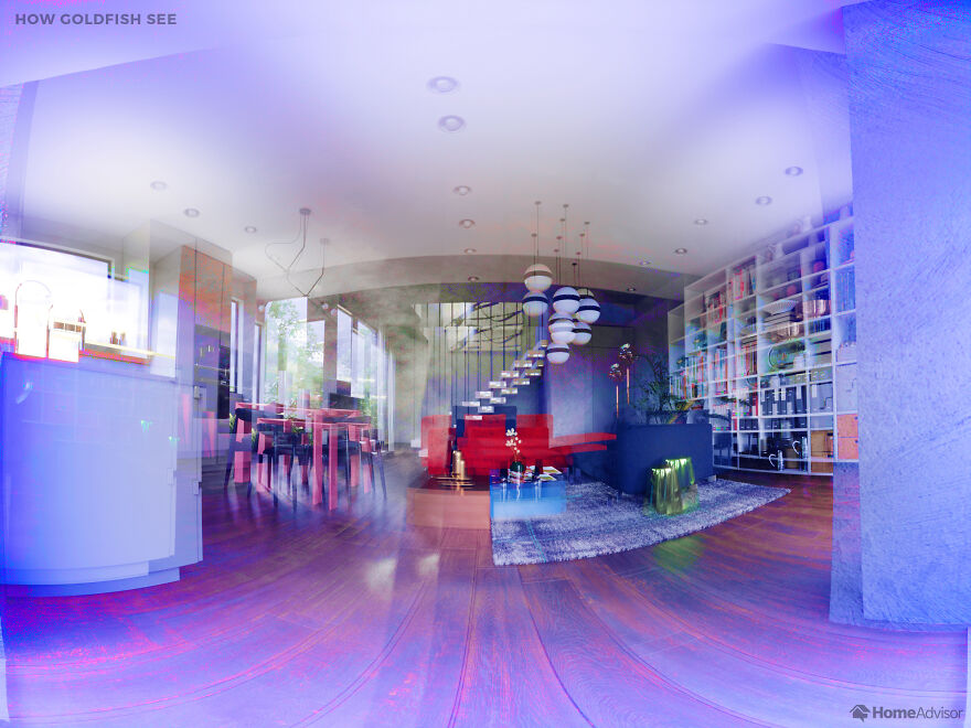 ▼金魚視角:金魚可以看到比人類更多的色彩,牠能夠吸收紫外光線,幫助牠們在水下視物。我們俗稱的金魚眼效果,其實是魚的圓形角膜360度收集光線,並且密度幾乎與水相同,以補償光線在水中的扭曲效果。