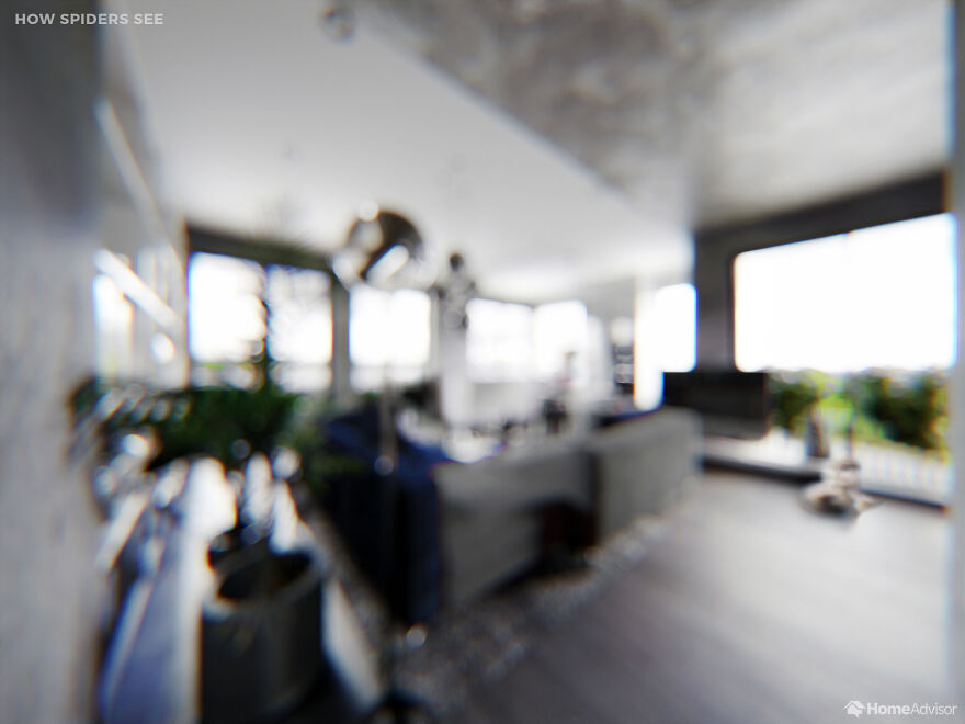 ▼蜘蛛視角:蜘蛛有8只視力微弱的眼睛,相比用眼來看,他們更多的是依靠毛茸茸的腿來感知周圍的環境。不過最近研究發現,蜘蛛的視蛋白可能增強牠們對色彩的敏感度,也可能是用來尋找伴侶。