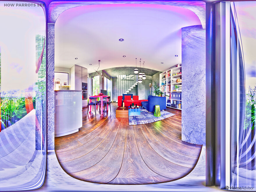 ▼鸚鵡視角:鳥類在日常生湖中非常依賴牠們高效的視覺系統,鸚鵡可以看到紫外線、藍色、綠色、紅色等等。其實圖片中的紫色部分就是鸚鵡能看到的紫外線,而人類是看不到的。鸚鵡還能夠超快速調整焦點,牠們有近300度的視野範圍,還有單眼視覺,這就意味著鸚鵡可以一隻眼睛聚焦事物上,而另外一隻眼睛看著其他的東西。牠還可以隨意收縮瞳孔,比如當牠不喜歡主人的新燈罩時。