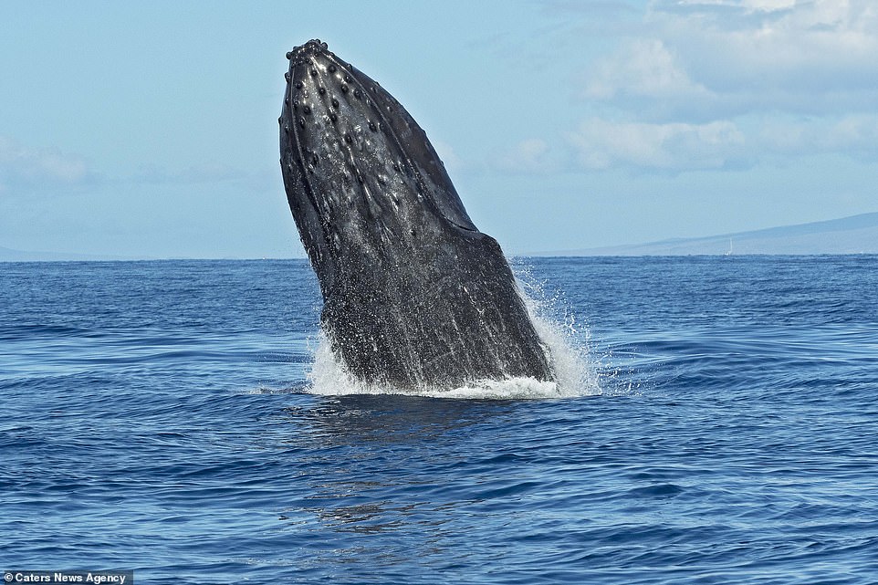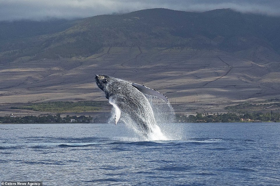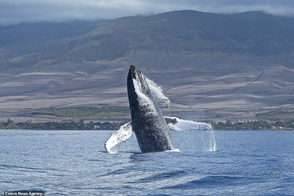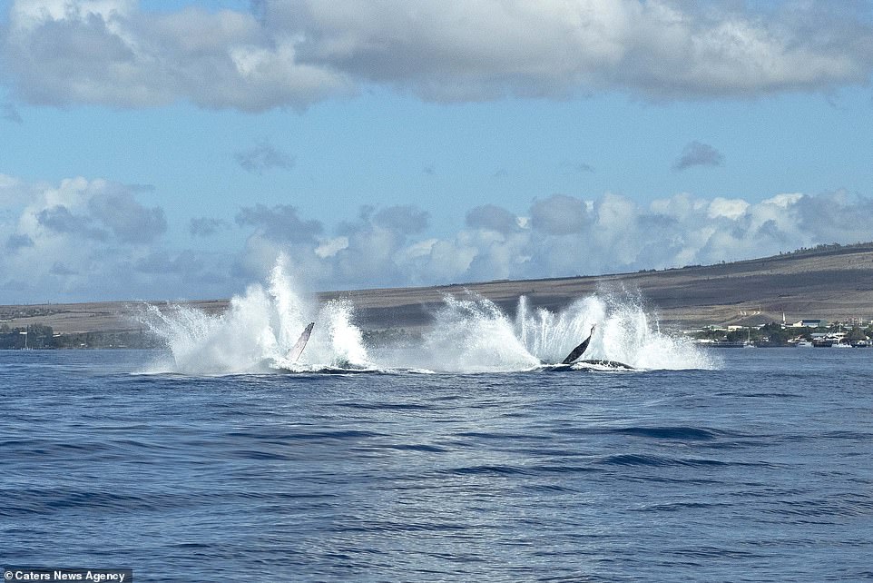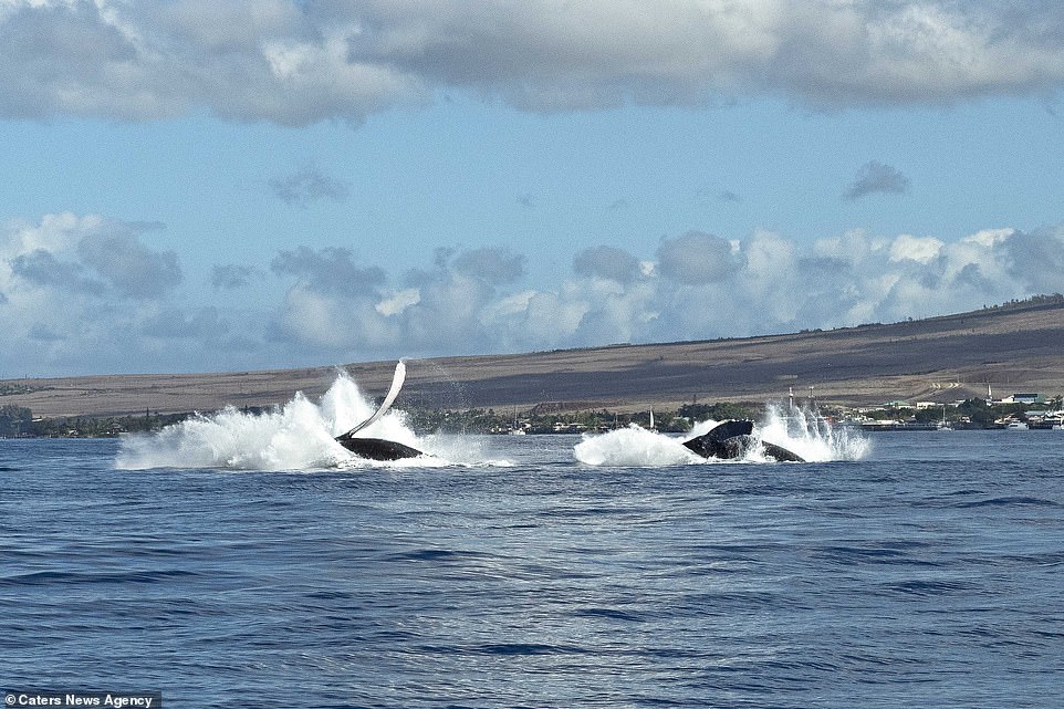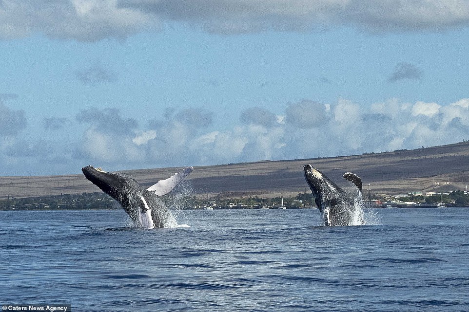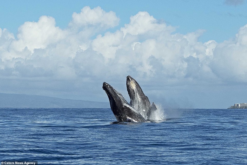 ▼這兩隻座頭鯨在水下互相追逐,又幾乎同步出現在茂宜島海岸附近,同時躍出水面。牠們的動作神同步,兩隻海洋巨獸同時出水,這一幕非常不可思議。