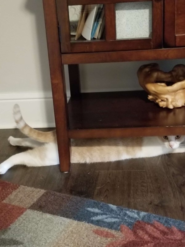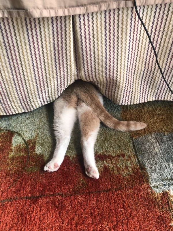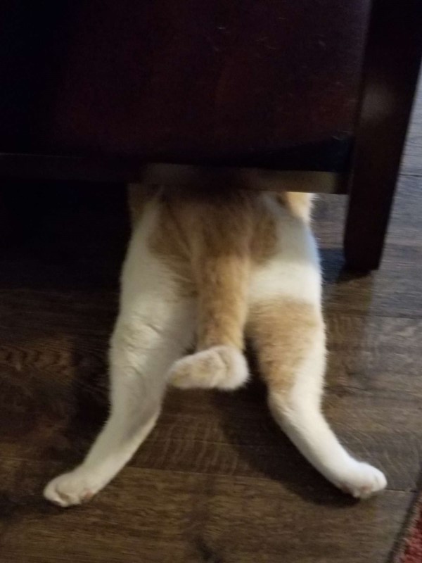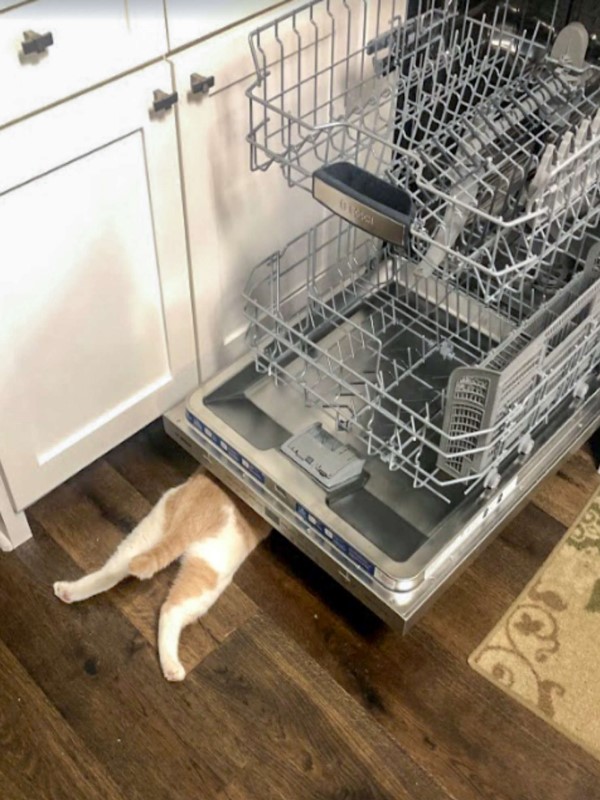 ▼Keanu會根據家具來選擇隱藏地點,牠有時趴在櫃子下,有時藏在沙發下,還會窩到開啟的洗碗機門下的縫隙裡。牠很喜歡躲藏,但露出小屁屁,還堅信大家看不到牠的樣子,看起來傻傻的,非常可愛。
