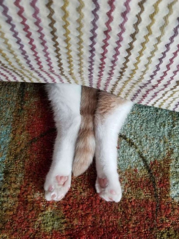 ▼Keanu雖然很擅長捕獵,但不擅長玩躲貓貓。牠習慣躲起來觀察家人的一舉一動,尤其是牠最愛的把拔。但牠的躲藏方式很滑稽,經常藏在家具下,露出自己的小PP,還以為沒有人發現自己。