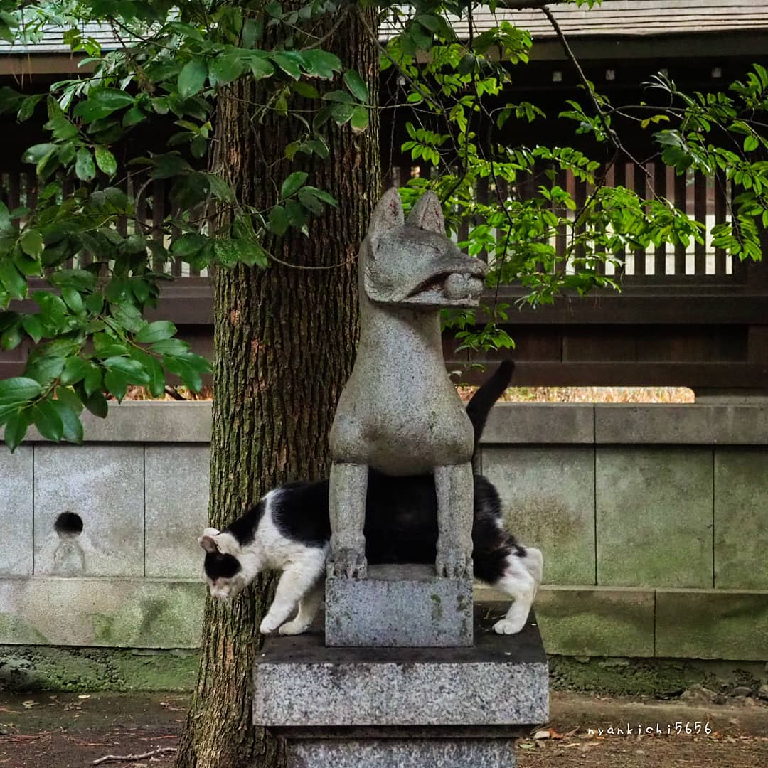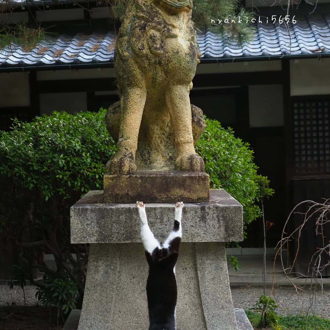 ▼神社內的雕塑造景就是他們最有趣的貓跳台!