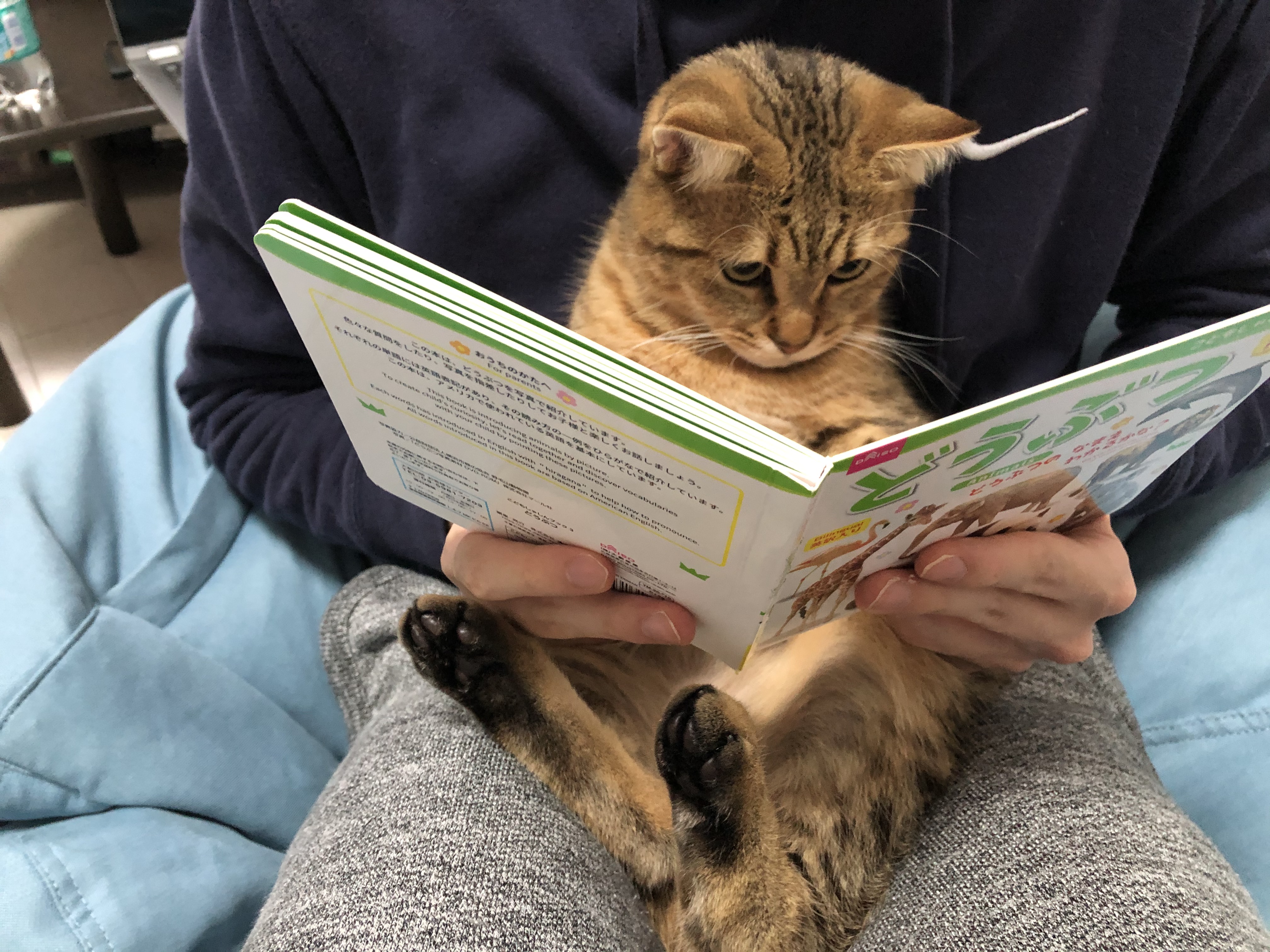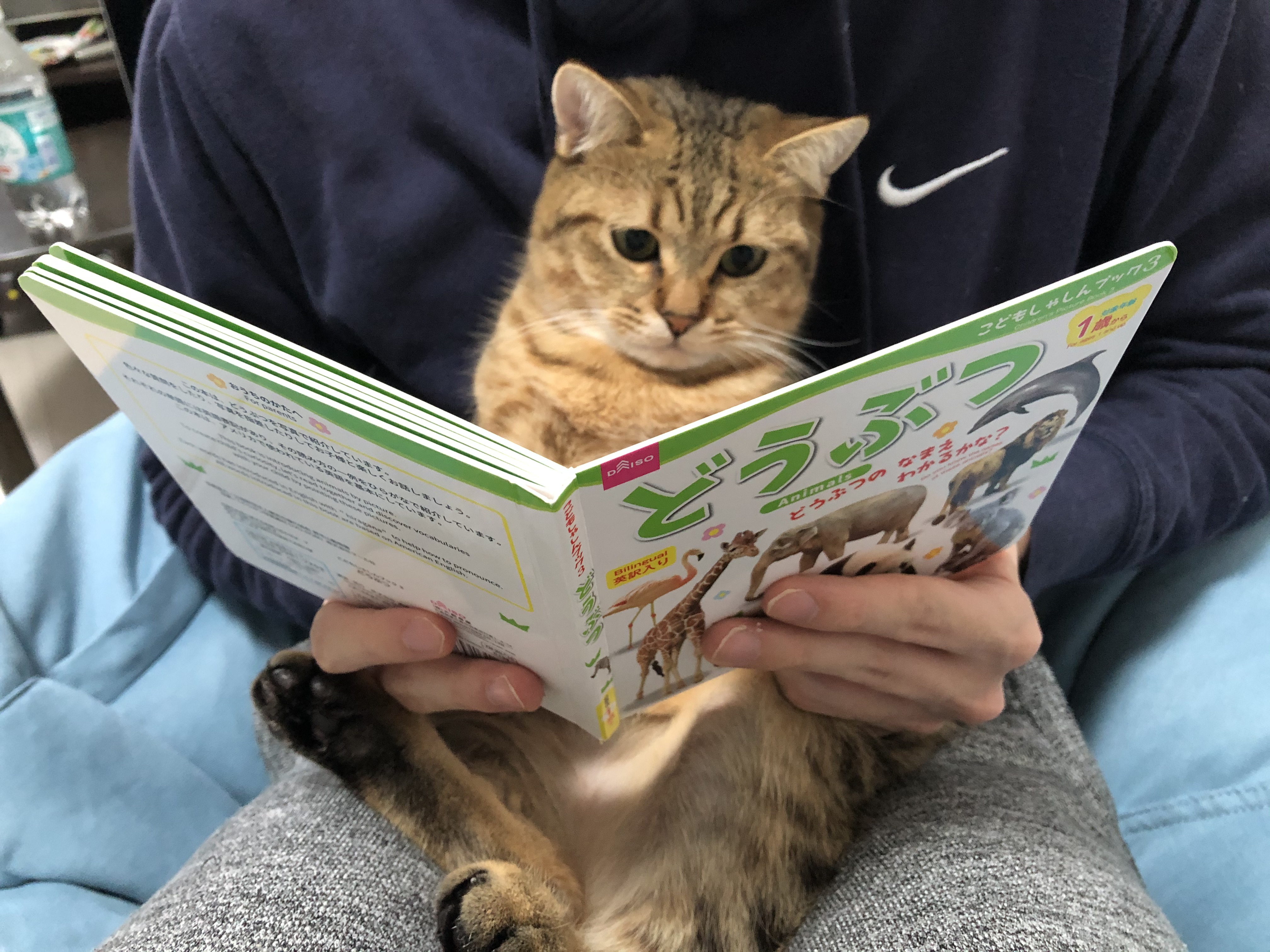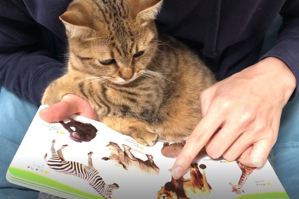 ▼從照片中可以看到,虎斑貓Minira坐在奴才的腿上,一臉專注的盯著圖鑑中的動物照片,就像是認真看繪本的小寶寶一樣。